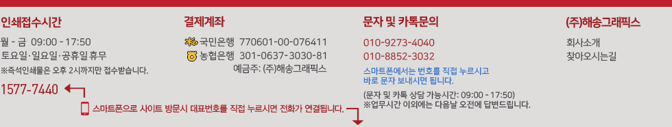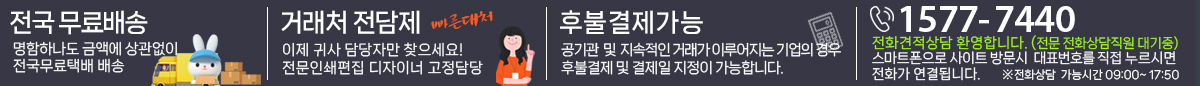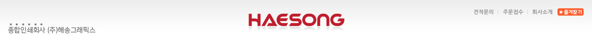 당사 웹사이트의 이미지 및 자체 개발한 웹사이트 구성체계는 주식회사 해송그래픽스에 저작권이 있습니다. 상업목적으로 무단도용 및 복사배포시에는 법적 처벌을 받게됨을 알려드립니다. Images from our website and the structure of our own developed web site are copyrighted by our company's Haesong Graphics. You will be legally punished for illegally copying and distributing copies for commercial purposes
